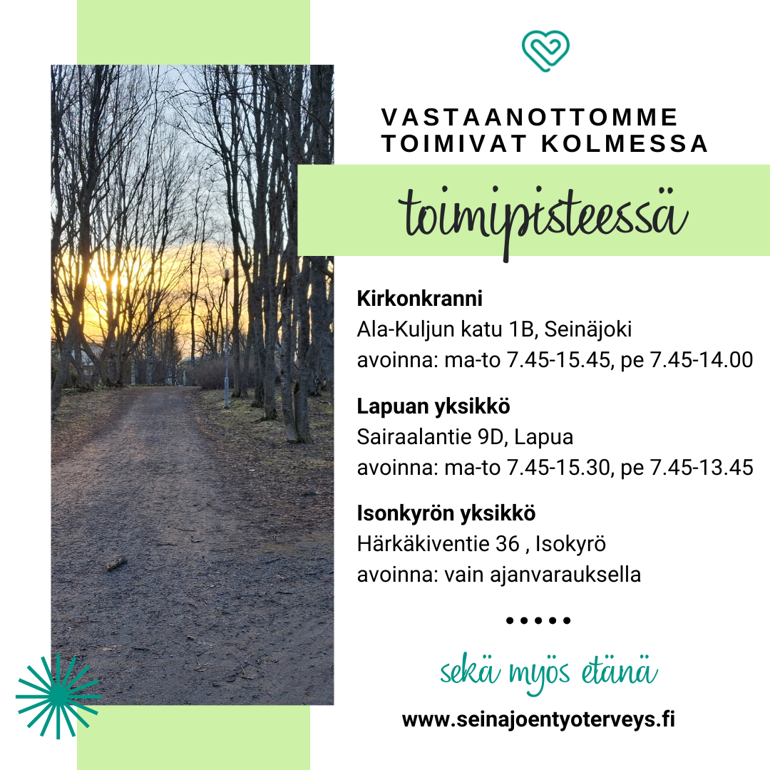Tavoitteellista ja kannattavaa työterveyshuoltoa tarjoaa kolme toimipistettämme: Kirkonkranni Seinäjoen keskustassa, Lapuan yksikkö Sairaalantiellä sekä Isonkyrön toimipiste terveysasemalla.