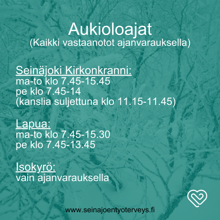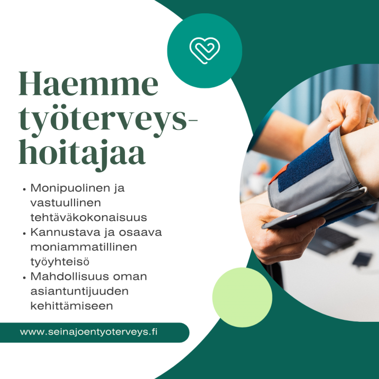 HAEMME TYÖTERVEYSHOITAJAA Vakituiseen työsuhteeseen Seinäjoen toimipisteeseen. Työ alkaa sopimuksen mukaan. Haemme joukkoomme työterveyshoitajaa, jolla on myös yritysvastuu. Tehtävässä vastaat nimettyjen asiakasorganisaatioiden, erityisesti hyvinvointialueen työntekijöiden, työterveyshuollon toteuttamisesta ja kehittämisestä. Edellytämme sinulta terveydenhoitajan tutkintoa. Työterveyshuollon pätevöitymiskoulutus sekä aikaisempi kokemus työterveyshuollosta katsotaan eduksi.…